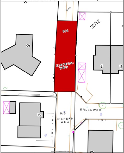 Ausschnitt aus dem Lageplan ist die Straßenfläche in roter Farbe dargestellt.